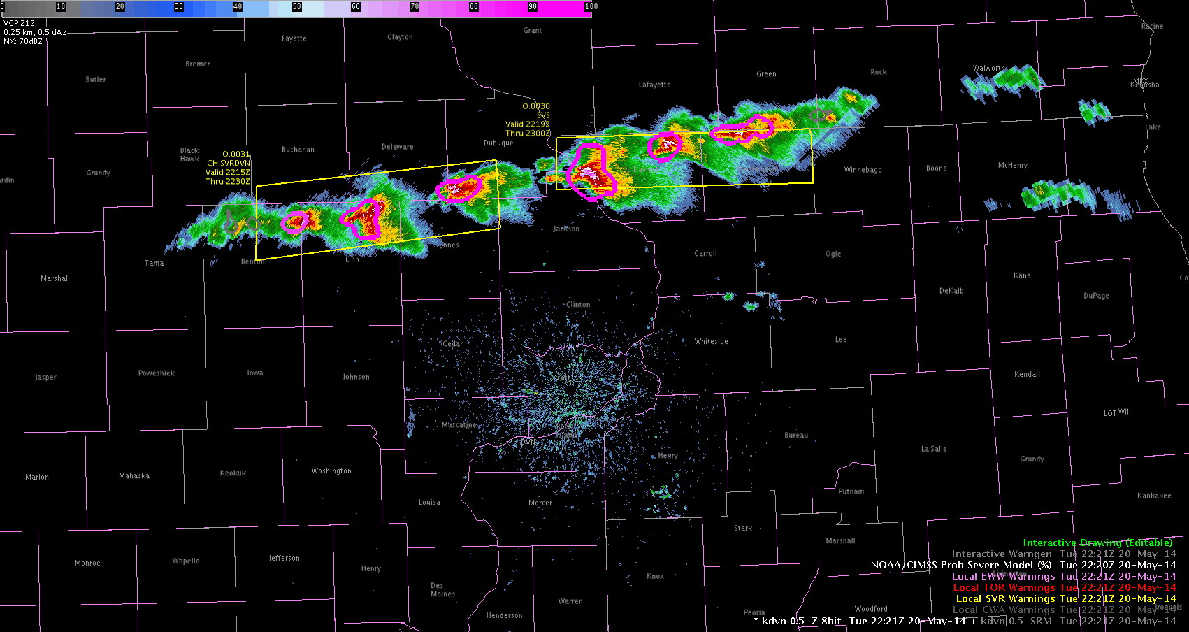 It has been a very active day with storms over our warning area. The Prob. of Severe tool really helped me focus in on the storms that were more intense and then I was able to use Dual-Pol info to help verify and issue the warnings. I was able to observe that the Prob of Severe as it followed the strengthening and thus weakening of the individual storms. As you can see from above…when they turned the hot pink color..is normally when I was issuing the warning and actually allowed the warnings to expire when they started to drop down to the gray color. This also verified with storm spotter data so I find this tool very useful and I really like it. ~Vollmar