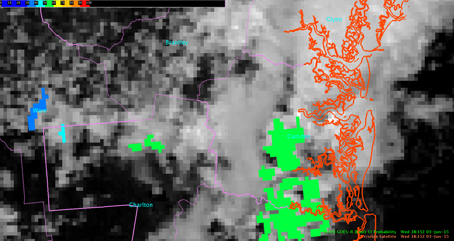 The CI probability increased to 56% at 1815Z in north-central Charlton County. In the proceeding images at 1830, 1845 and 1900Z, the visible satellite imagery shows significant convective development in that area. I am a little surprised that the CI only went up to 56% and that the green CI prob area that showed up on my display was relatively small compared to how much convective growth actually occurred.